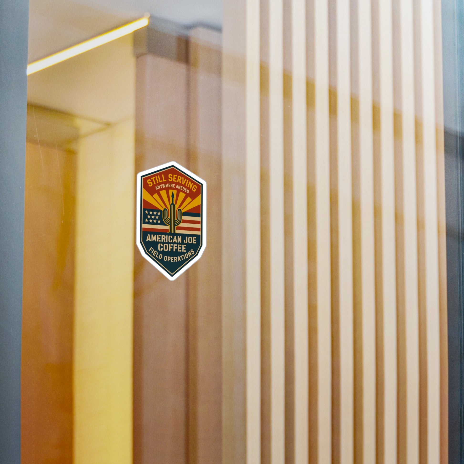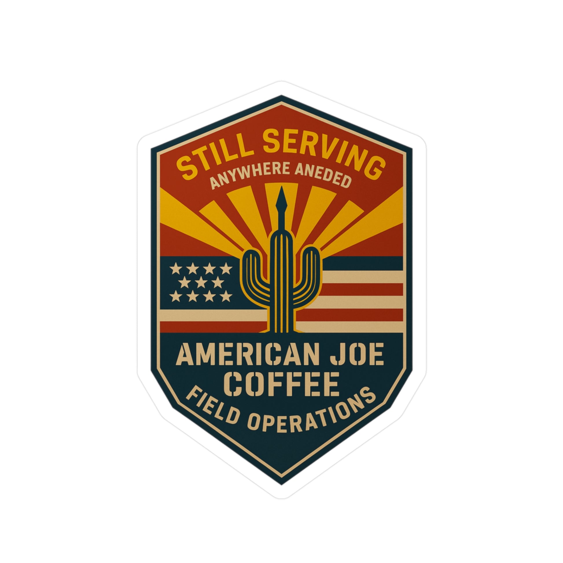 Field OPS Kiss-Cut Vinyl Decal – American Joe Coffee 'Still Serving' Desert Flag Badge